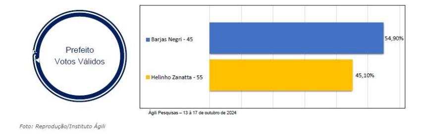 com 54,9% das intenções de voto. Helinho Zanatta (PSD) segue com 45,1% dos votos válidos. A margem de