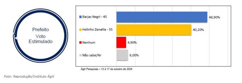No cenário estimulado, onde os nomes dos candidatos são apresentados, Barjas tem 48,9%, enquanto Helinho